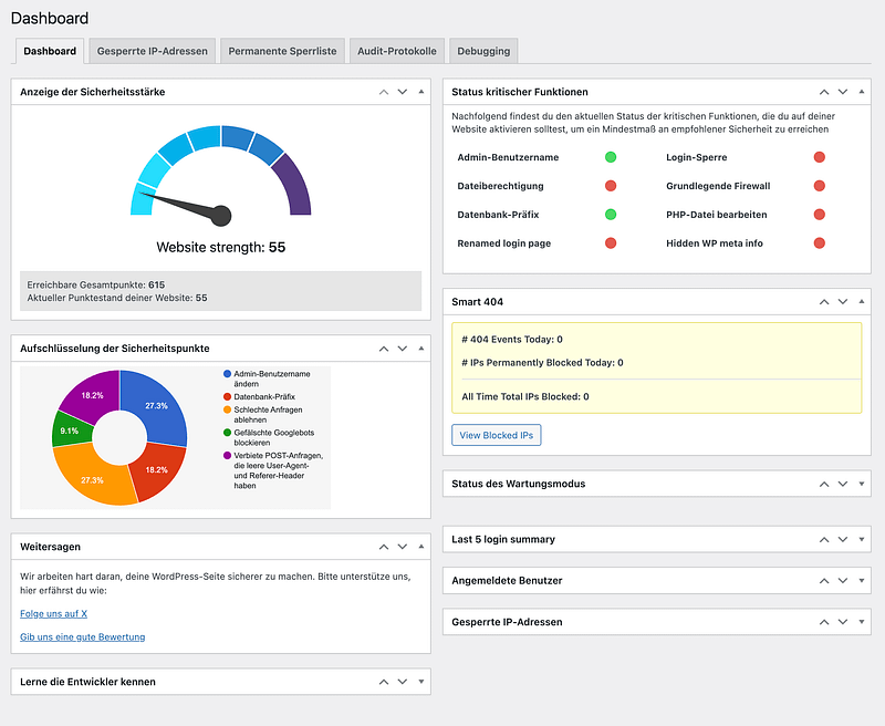 All-in-One Security ist das meist geladene Sicherheitsplugin auf Wordpress. Es schützt deine Dateien und Daten vor Missbrauch und beugt Spam vor. Mit den Einstellungen für die Sicherheit deiner Login-Daten wird es unmöglich in deine Seite ein zu brechen, selbst wenn deine Database kompromittiert wurde.