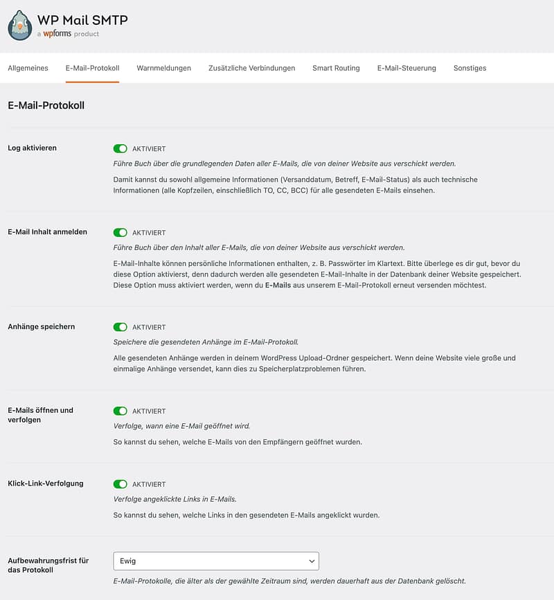 WP Mail SMTP gibt es in der kostenlosen und Pro Version. In der Pro Version kommen einige Features hinzu, wie mehr Anbieter und detaillierte E-Mail Protokolle. So kannst du zum Beispiel sogar sehen welche E-Mail wann geöffnet wurde – super um zu prüfen, welche Mails ungelesen im Postfach bleiben. Wenn du WP Mail SMTP über unsere Agentur abschließt, bekommst du einen unschlagbaren Preis auf die Pro Version ;)